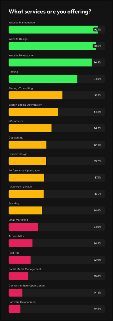 Badania branżowe na podstawie 1233 ankietowanych freelancerów i agencji tworzących strony internetowe wykazały, że tylko około połowa oferuje usługi i posiada doświadczenie w SEO i copywritingu, a jedynie około 20% potrafi łączyć projektowanie stron z obszarami takimi jak, kampanie reklamowe czy optymalizację konwersji.